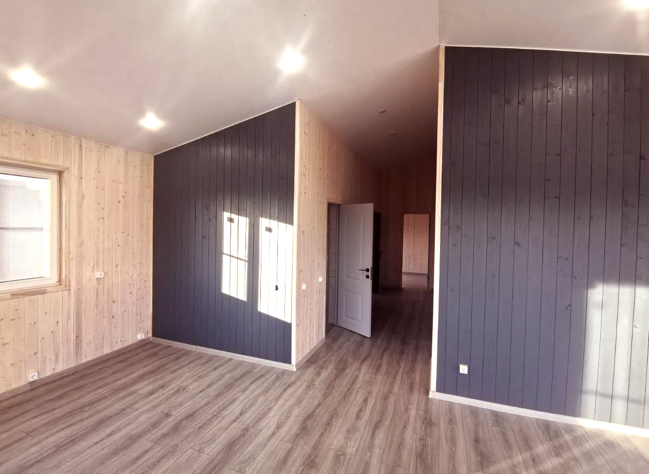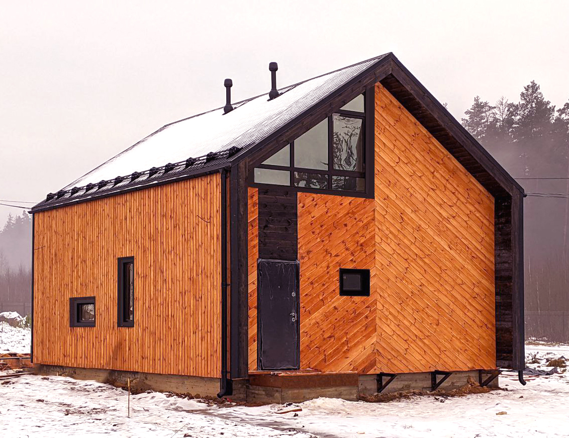 По проекту. Обрезная доска, 200 мм камерной сушки, стойки, ригеля, диагональные укосины. Стены снаружи зашиваются виниловый сайдинг DOCKE или панели фасадные гибкие Hauberk с обрешёткой и ветрозащитной мембраной. Шаг 0,59 м. Утепление 200 мм, минеральной ватой (плиты). Изнутри монтируется пароизоляция и внутренняя отделка, присутствует вент-зазор (возможна замена фасада на Фиброцементный сайдинг, Имитацию бруса, Гибкий кирпич, Проф. лист) уточняйте у менеджера.