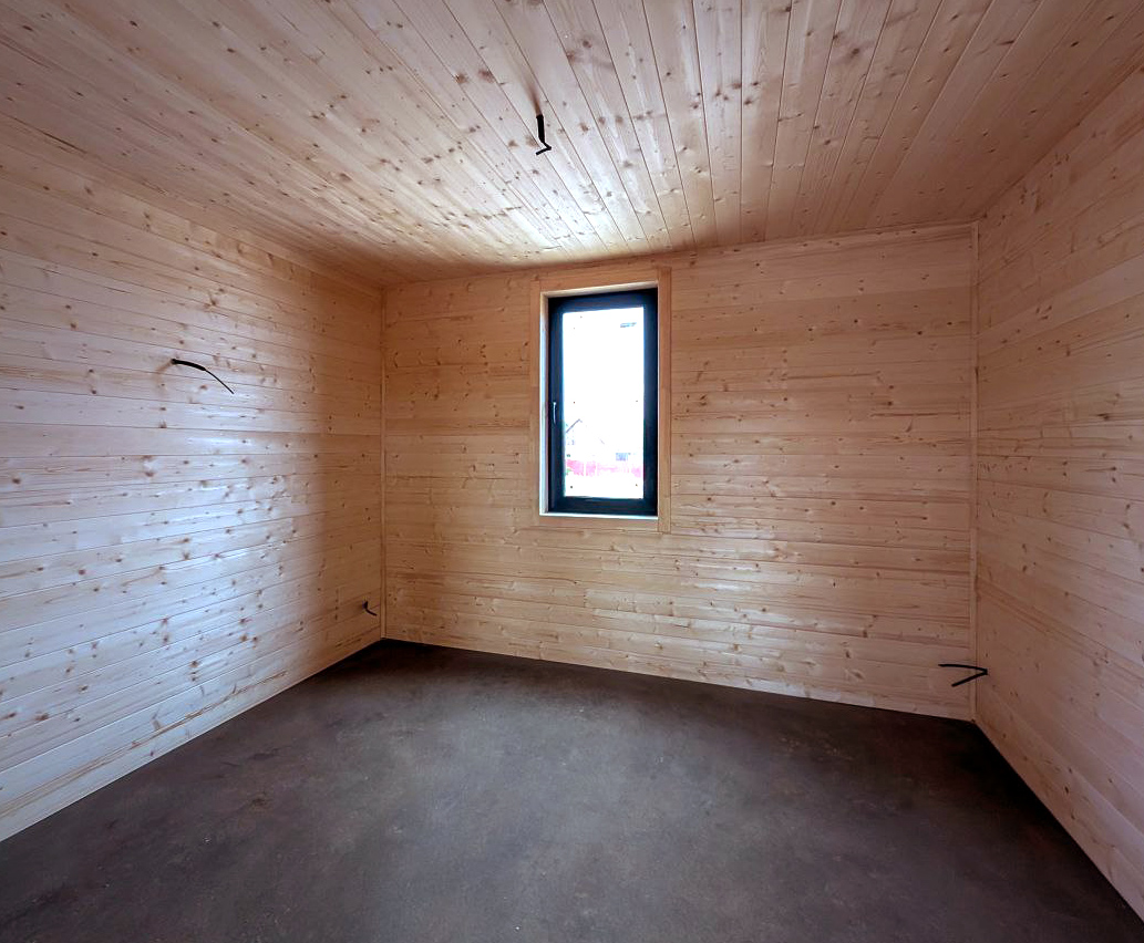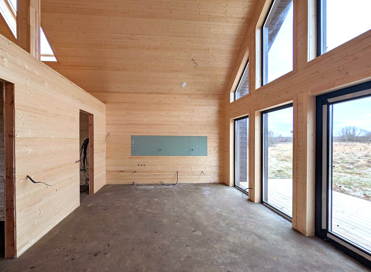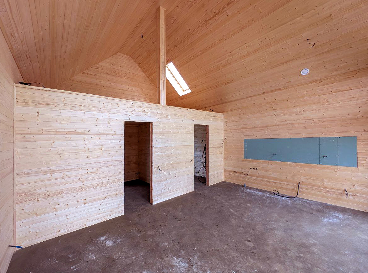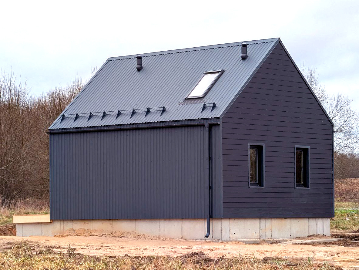 По проекту. Обрезная доска, 200 мм камерной сушки, стойки, ригеля, диагональные укосины. Стены снаружи зашиваются виниловый сайдинг DOCKE или панели фасадные гибкие Hauberk с обрешёткой и ветрозащитной мембраной. Шаг 0,59 м. Утепление 200 мм, минеральной ватой (плиты). Изнутри монтируется пароизоляция и внутренняя отделка, присутствует вент-зазор (возможна замена фасада на Фиброцементный сайдинг, Имитацию бруса, Гибкий кирпич, Проф. лист) уточняйте у менеджера.