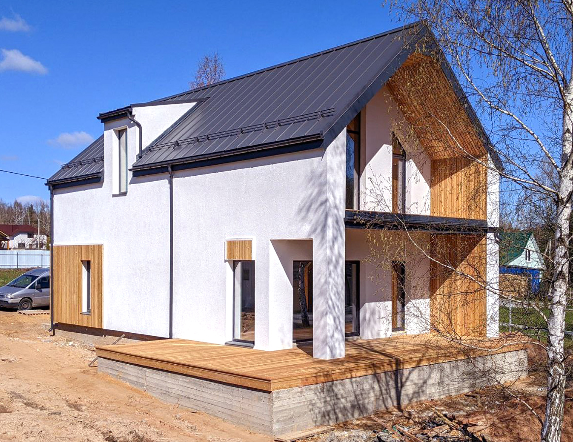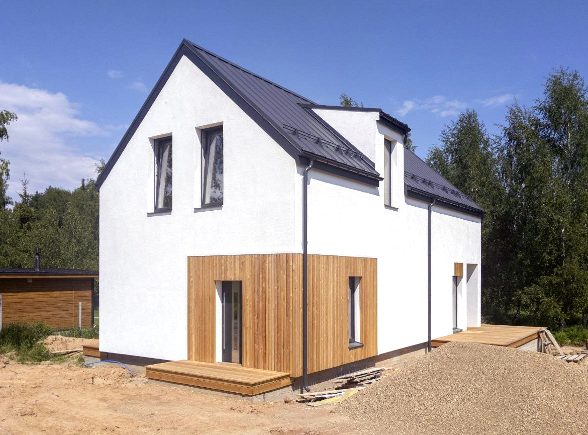 По проекту. Обрезная доска, 200 мм камерной сушки, стойки, ригеля, диагональные укосины. Стены снаружи зашиваются виниловый сайдинг DOCKE или панели фасадные гибкие Hauberk с обрешёткой и ветрозащитной мембраной. Шаг 0,59 м. Утепление 200 мм, минеральной ватой (плиты). Изнутри монтируется пароизоляция и внутренняя отделка, присутствует вент-зазор (возможна замена фасада на Фиброцементный сайдинг, Имитацию бруса, Гибкий кирпич, Проф. лист) уточняйте у менеджера.