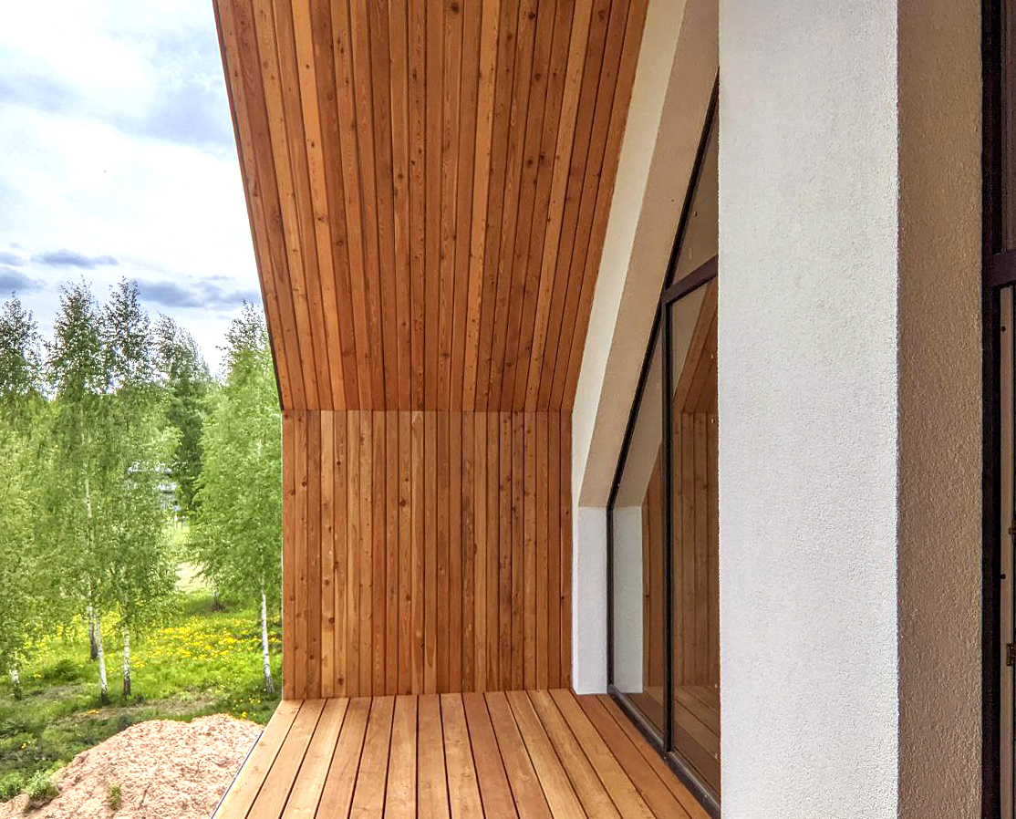 По проекту, подшиты вагонкой камерной сушки, виниловыми софитами, другое, ширина карнизов 0,6 м, уточняйте у менеджера.