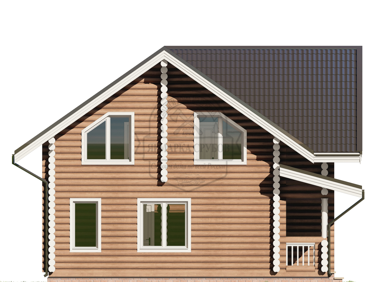 По проекту, бревно или зашиты обрезной доской 25х150 мм. Каркас фронтонов, доска 50х150 мм. Высота фронтонов, по проекту 1,5 - 2.6 м.