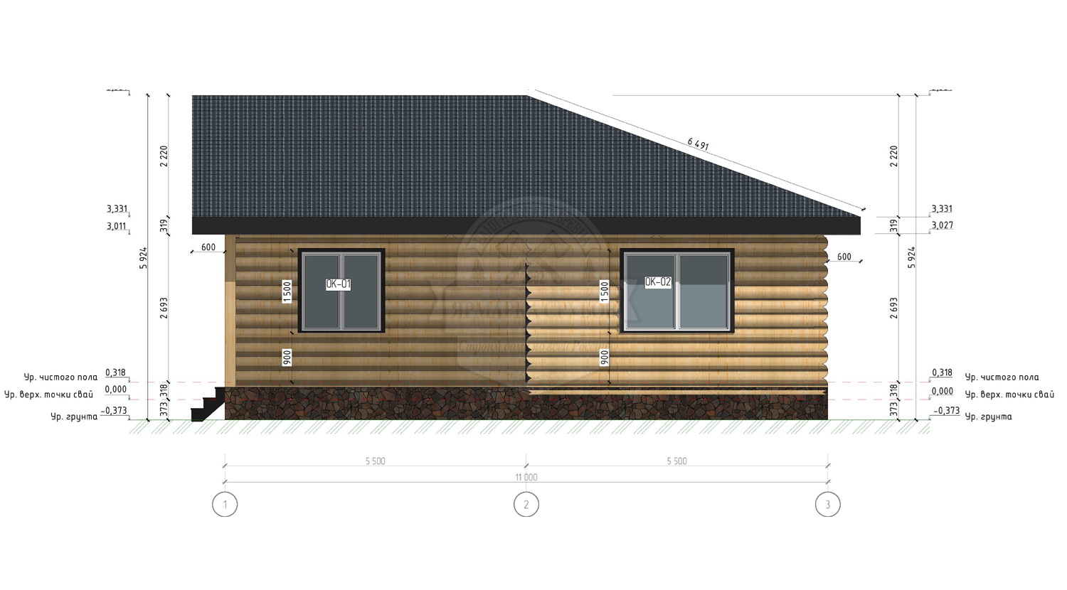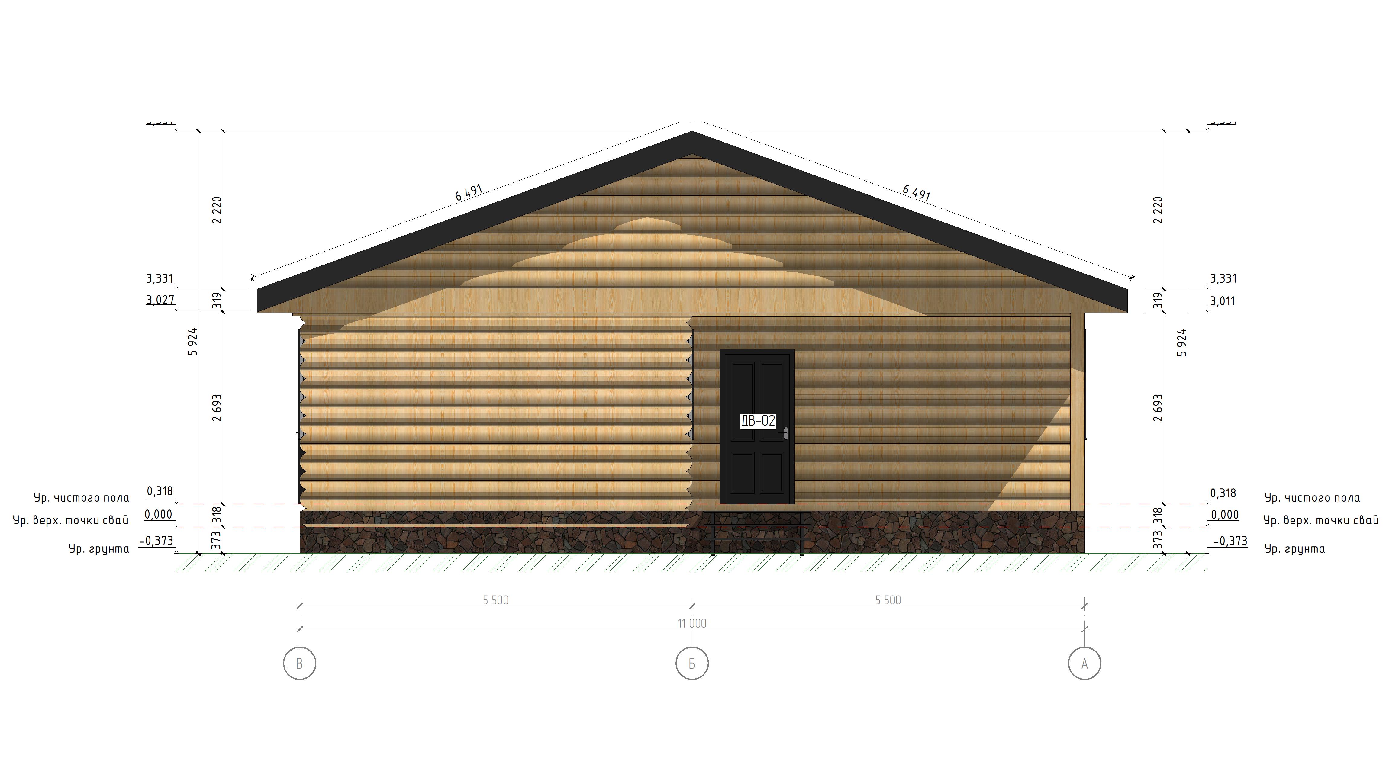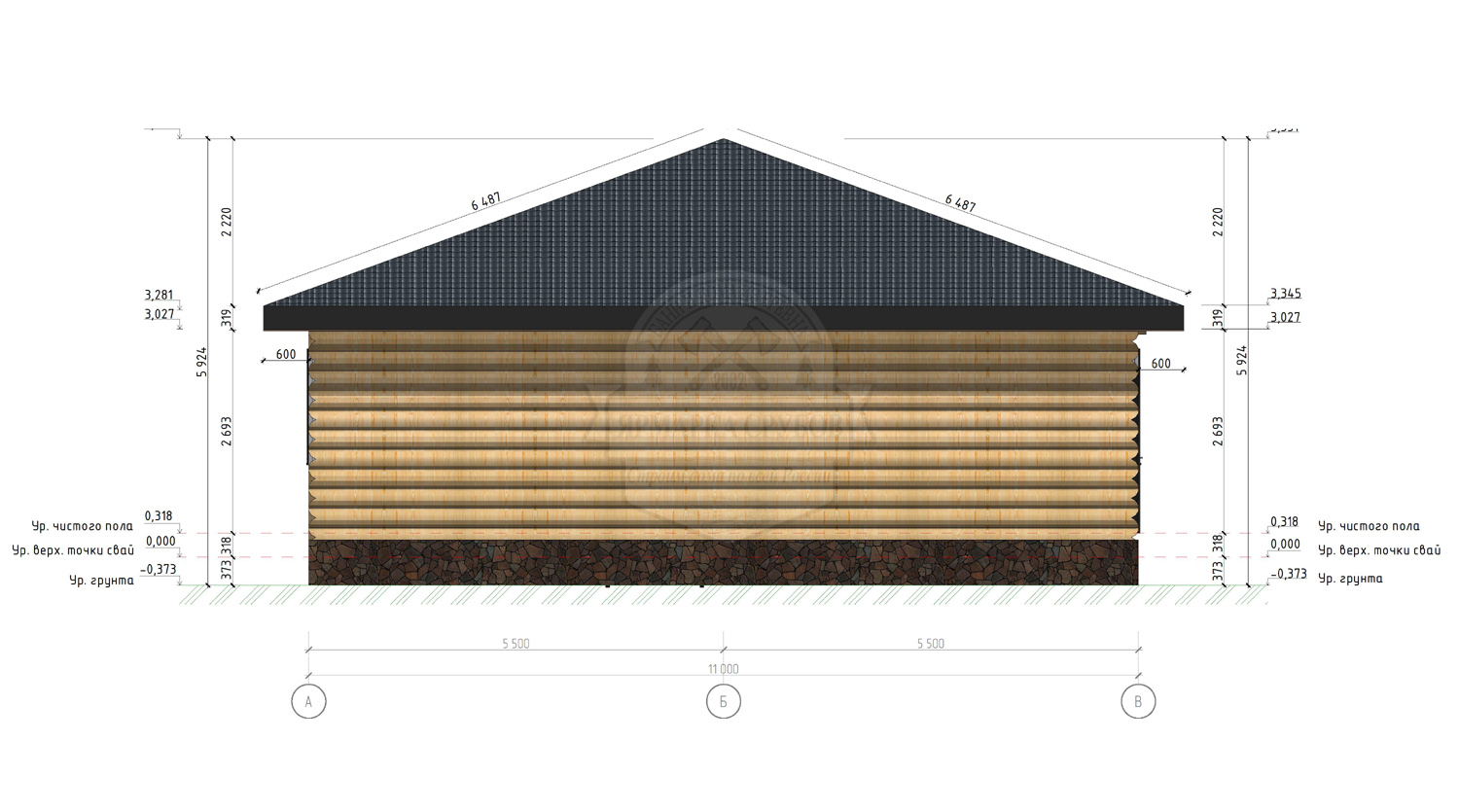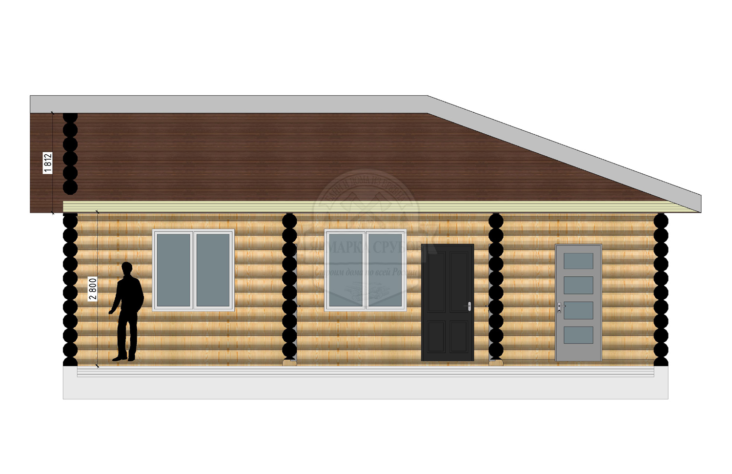 По проекту, бревно или зашиты обрезной доской 25х150 мм. Каркас фронтонов, доска 50х150 мм. Высота фронтонов, по проекту 1,5 - 2.6 м.