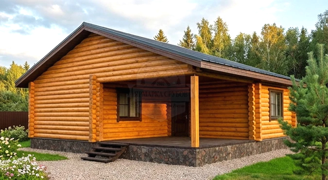 По проекту. Выпуски верхнего и нижнего венцов по длинной стороне сруба длиной до 3 метров, опорные стойки из круглого бревна.