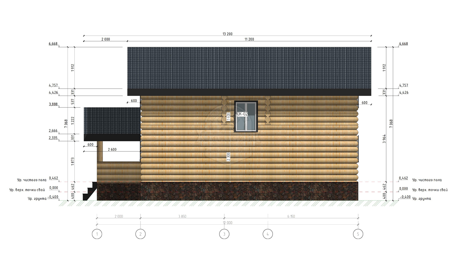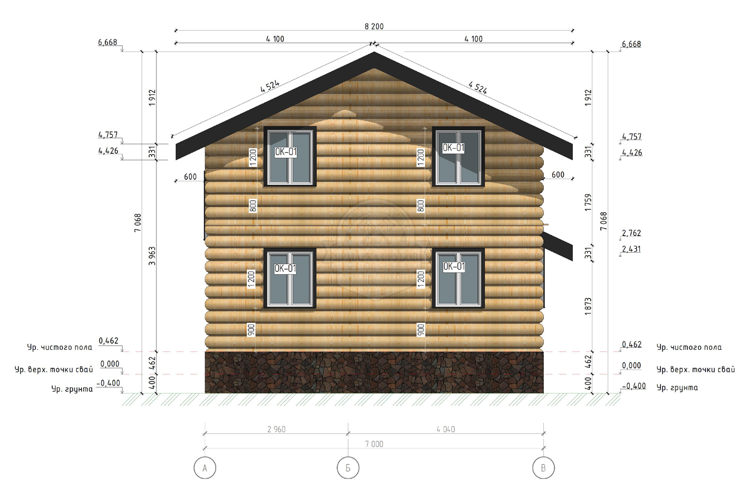 По проекту, бревно или зашиты обрезной доской 25х150 мм. Каркас фронтонов, доска 50х150 мм. Высота фронтонов, по проекту 1,5 - 2.6 м.