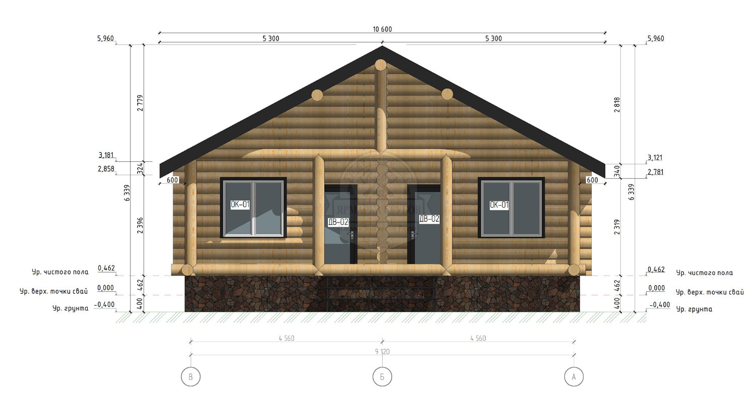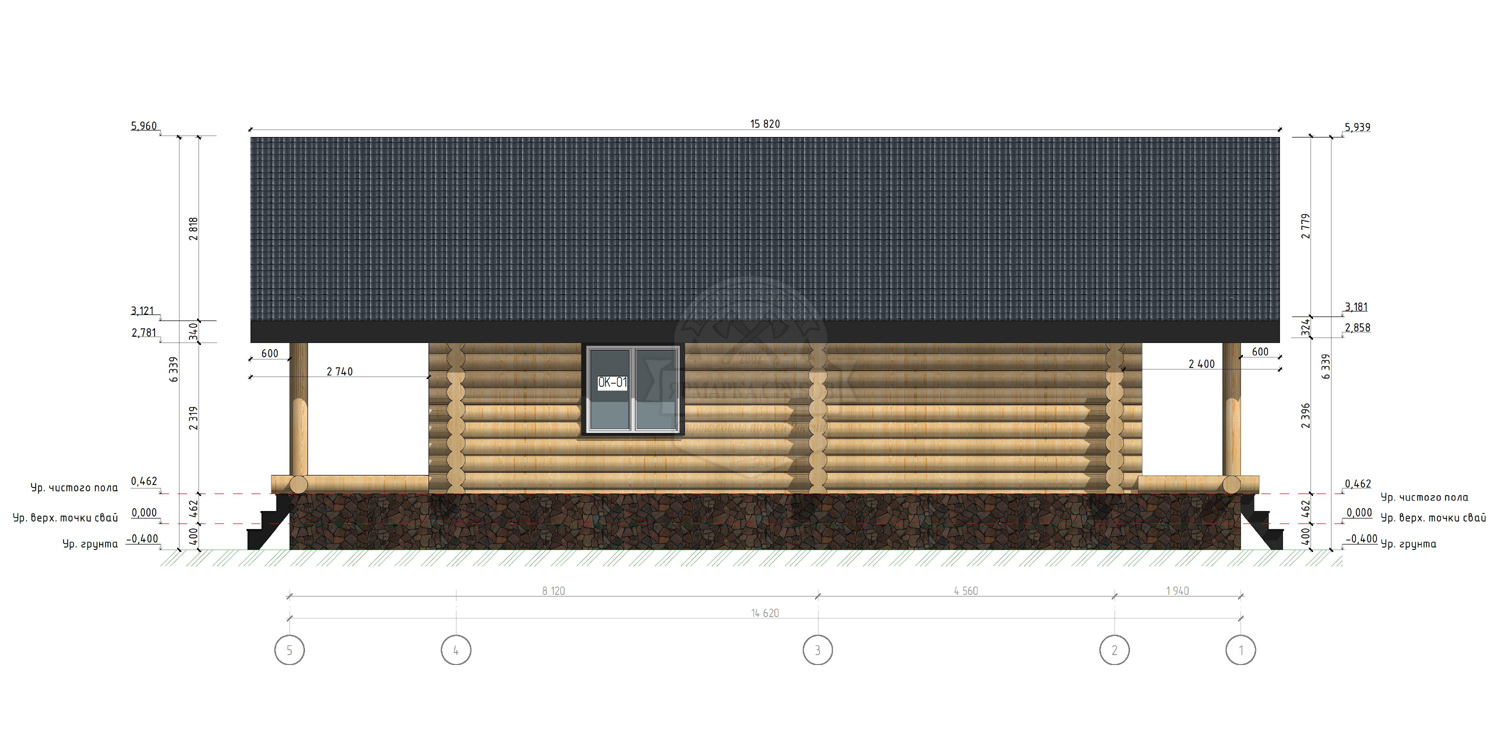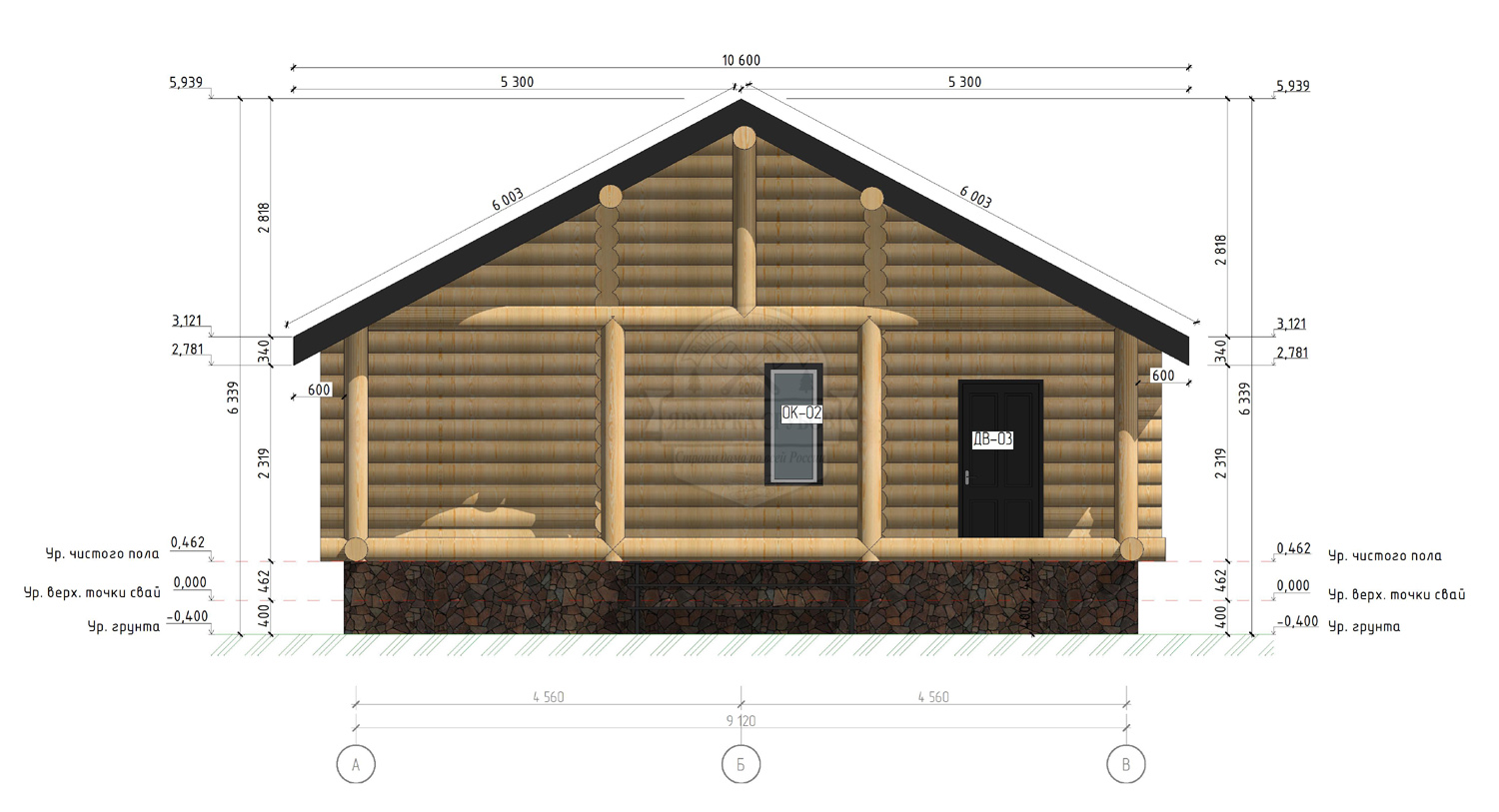 По проекту, бревно или зашиты обрезной доской 25х150 мм. Каркас фронтонов, доска 50х150 мм. Высота фронтонов, по проекту 1,5 - 2.6 м.