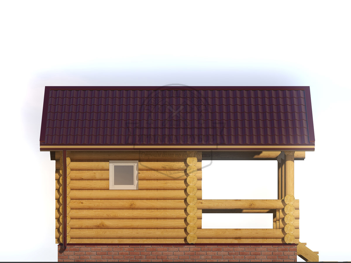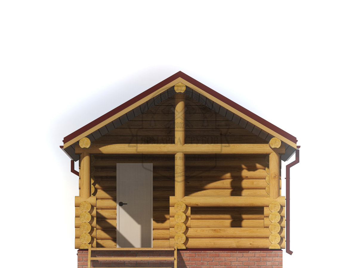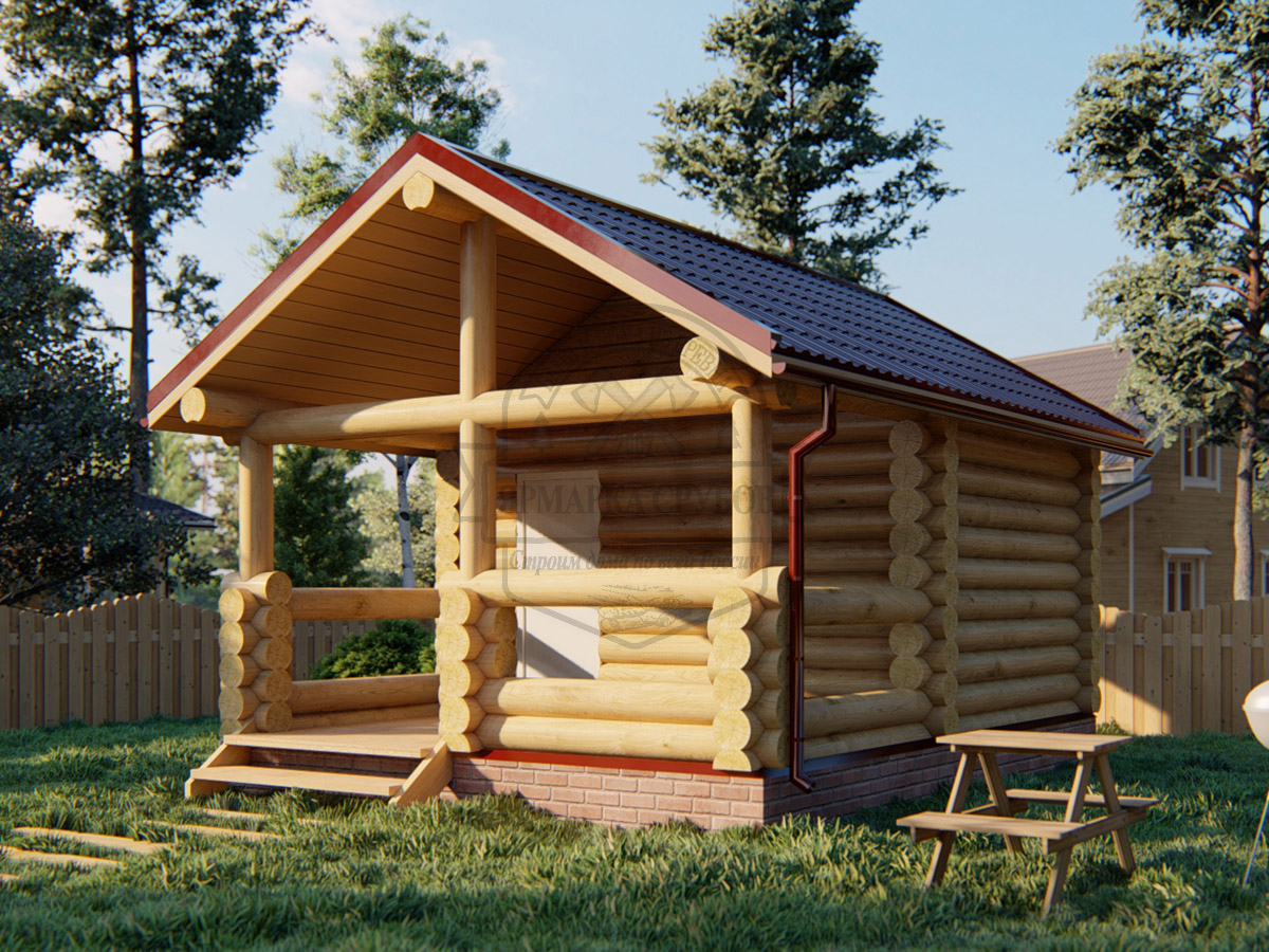 По проекту. Выпуски верхнего и нижнего венцов по длинной стороне сруба длиной до 3 метров, опорные стойки из круглого бревна.