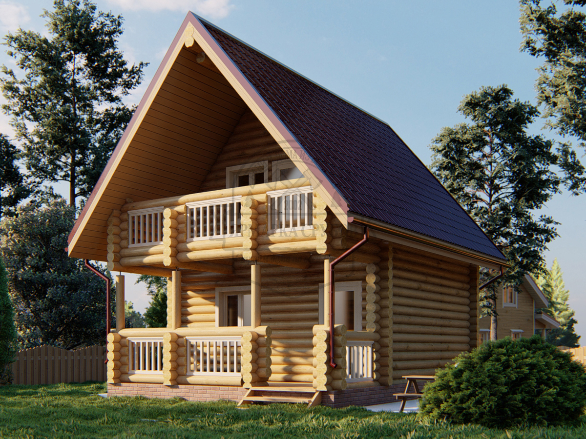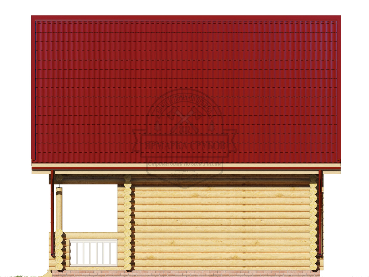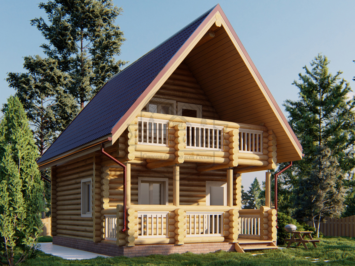 По проекту. Выпуски верхнего и нижнего венцов по длинной стороне сруба длиной до 3 метров, опорные стойки из круглого бревна.