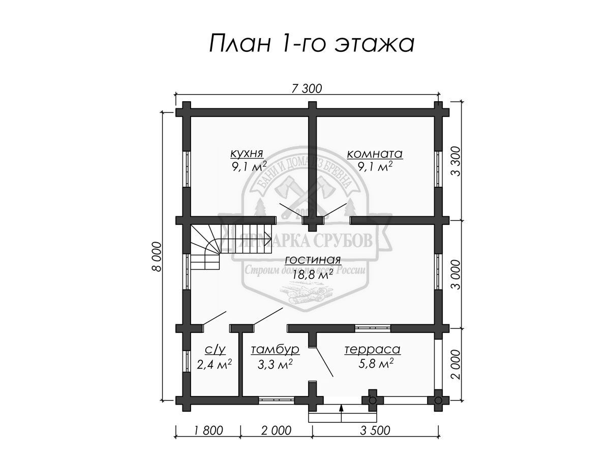 Дом из бревна 7,3х8 м